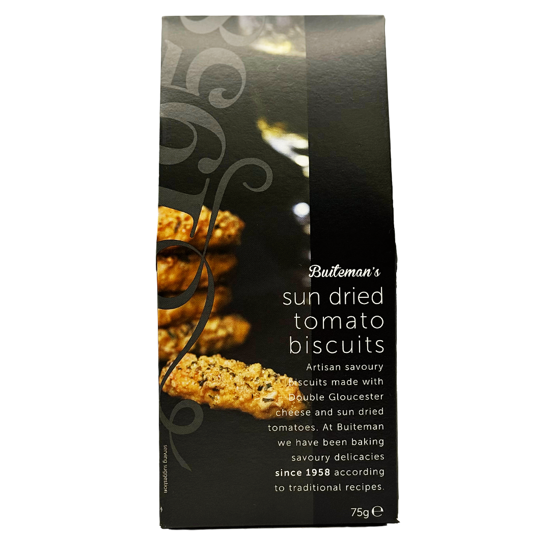 Artisan savoury biscuits made with double Gloucester cheese and the freshest sundried tomatoes. When Buiteman were experimenting with adding sun dried tomatoes to their baguette shaped bites, they almost accidentally discovered that robust English Double Gloucester perfectly supports the delicate flavour of those lovely vine ripened beauties. Double Gloucester, the most well-known Gloucester variety, is made with full cream only and has a characteristic, rich, buttery taste. Like in a good relationship, the two main ingredients of sun-dried tomato & cheese baguettes, complement each other beautifully.