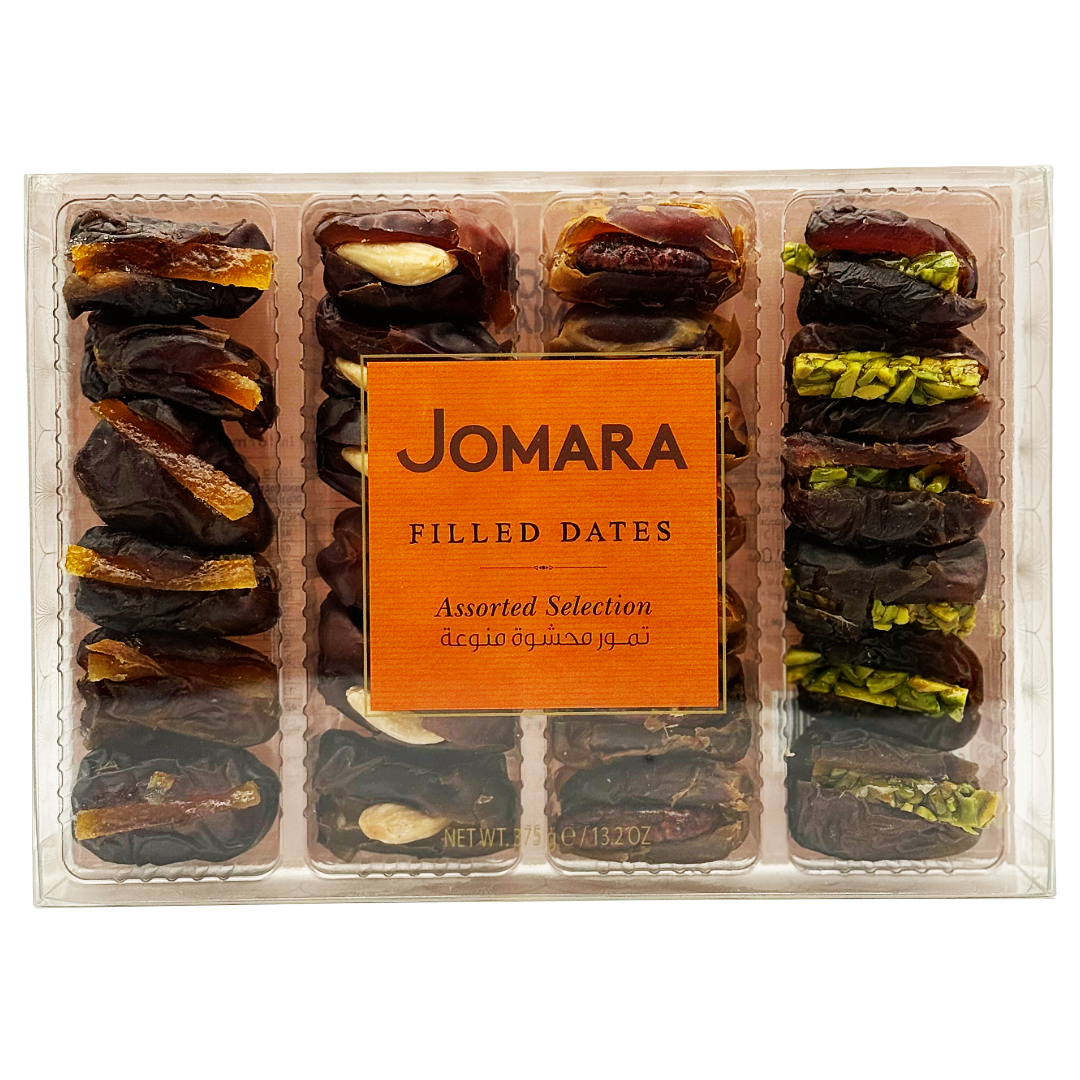A gourmet assortment of filled dates with orange peel, pistachios, caramelised pecan and roasted almond crafted using Jomara organic dates.