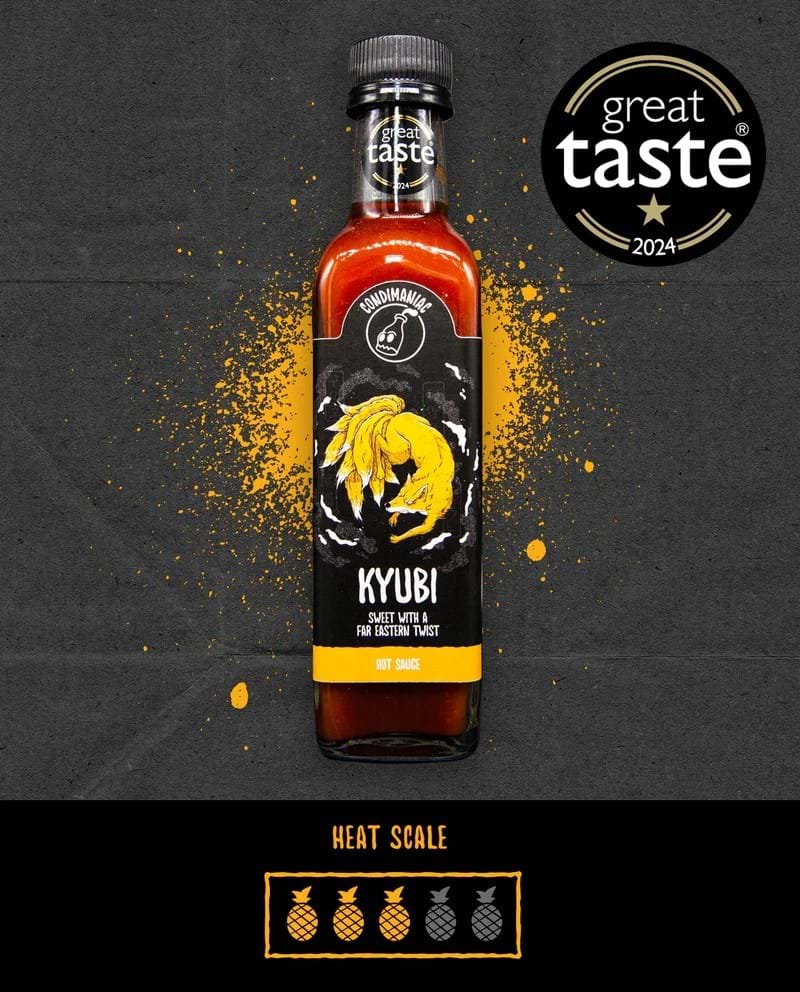 Condimaniac's very own Kyubi Hot Sauce. A medium hot artisan sauce inspired by flavours of East Asia, made with fresh Habanero chillies on a base of sweet pineapple and carrot, flavoured with 5-Spice. Heat 3/5. Goes great with: Sushi, eggs and East Asian cuisine.