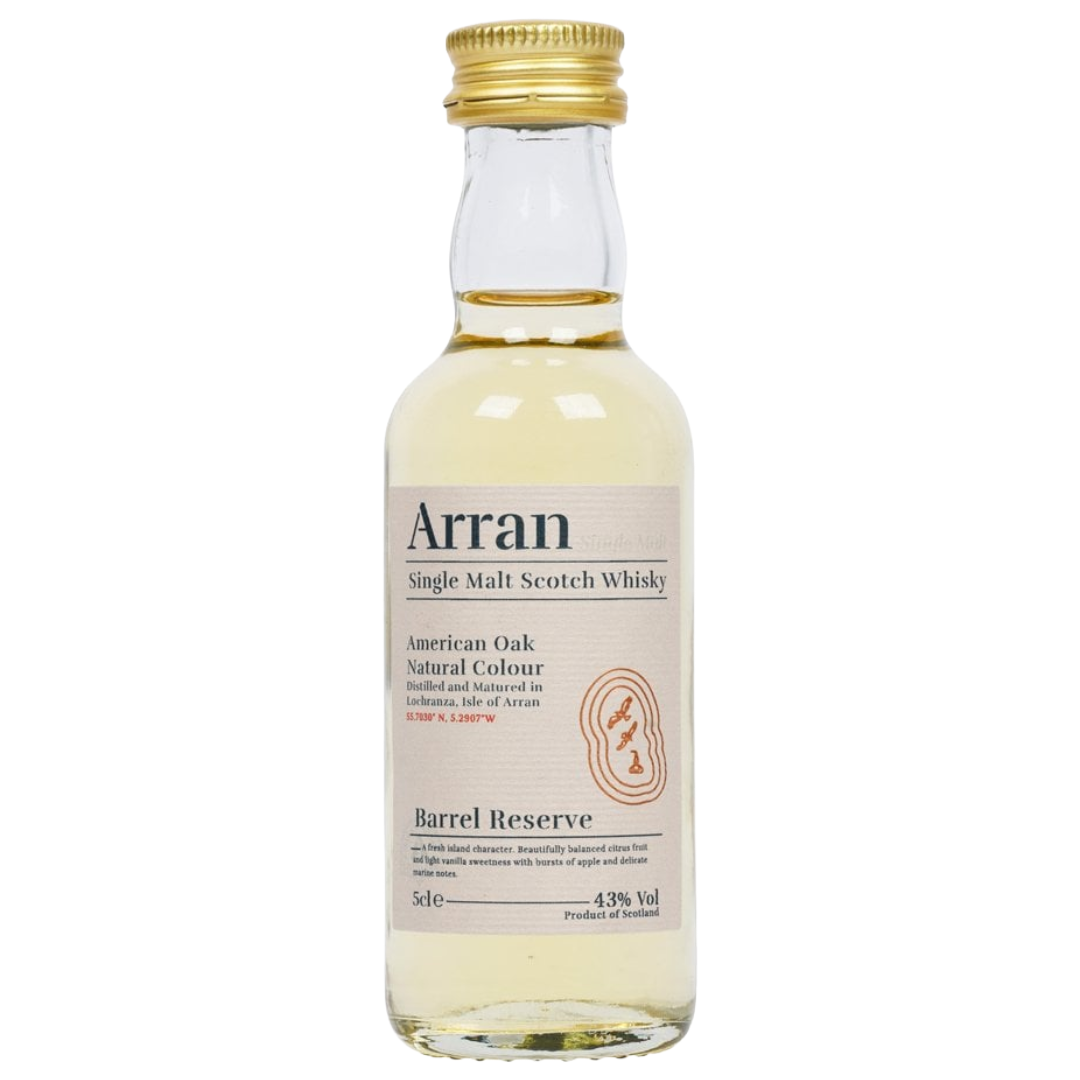 Arran Barrel Reserve offers a rich golden hue and a warm, inviting aroma of tropical fruits, honey, toasted oak, and a hint of vanilla. On the palate, it reveals layers of ripe banana, caramel, citrus zest, and gentle spice, all seamlessly integrated. The finish is smooth and lingering, with a delicate sweetness and subtle oak notes. This miniature captures the essence of Arran’s expertly matured single malt, delivering a satisfying and well-balanced drinking experience in every drop.*