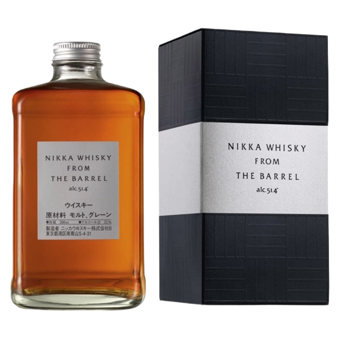 Nikka 'From The Barrel' Double-Matured Japanese Whisky is an exceptional blend that exemplifies the expertise of Nikka's master blenders. Combining multiple malt and grain whiskies, this whisky showcases rich flavours drawn from the barrels and is bottled at 51.4% ABV. It undergoes a "marriage" period of 3 to 6 months in used casks to harmonise its flavours effectively. The distinctive short squared bottle reflects the robust character within. On the nose, inviting aromas of butterscotch, orange peel, and poached pears mingle with earthy notes of dried leaves and tobacco. The palate offers a delightful mix of spices and a malty richness, making it exquisite when enjoyed neat or with a splash of water, earning a remarkable rating of 94/100 from Whisky Advocate.