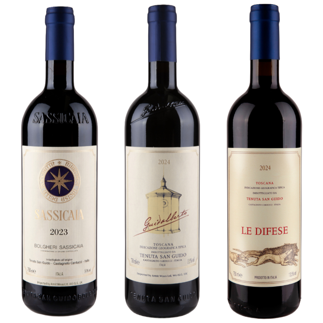 The bundle of 3 cases (of 6 bottles each) is priced at £1695 - 1 Sassicaia 2023, 1 Guidalberto 2024 & 1 Le Difese 2024. The cases are due to arrive with us here in Jersey in mid-2026.