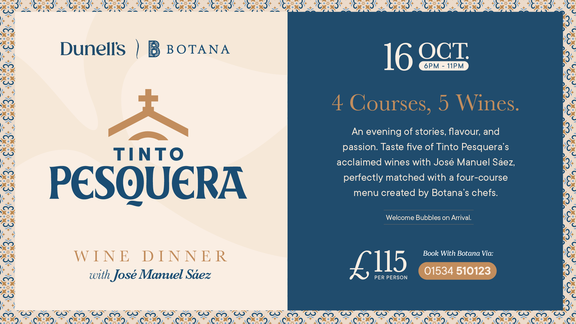 Expect an evening where Botana’s food meets Pesquera’s wines in all the right ways, with stories, pours, and plenty of Spanish flair.