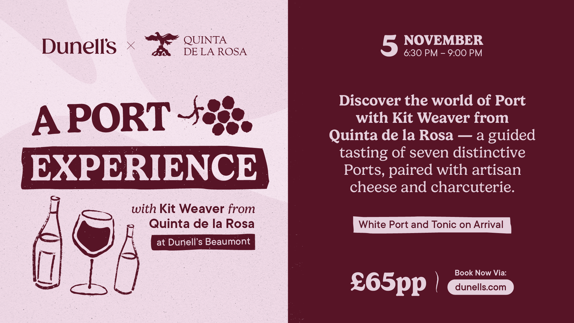 Join us as we welcome Kit Weaver from Quinta de la Rosa, one of Portugal’s most respected Port houses, for an intimate guided tasting at Dunell’s.